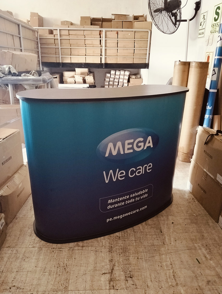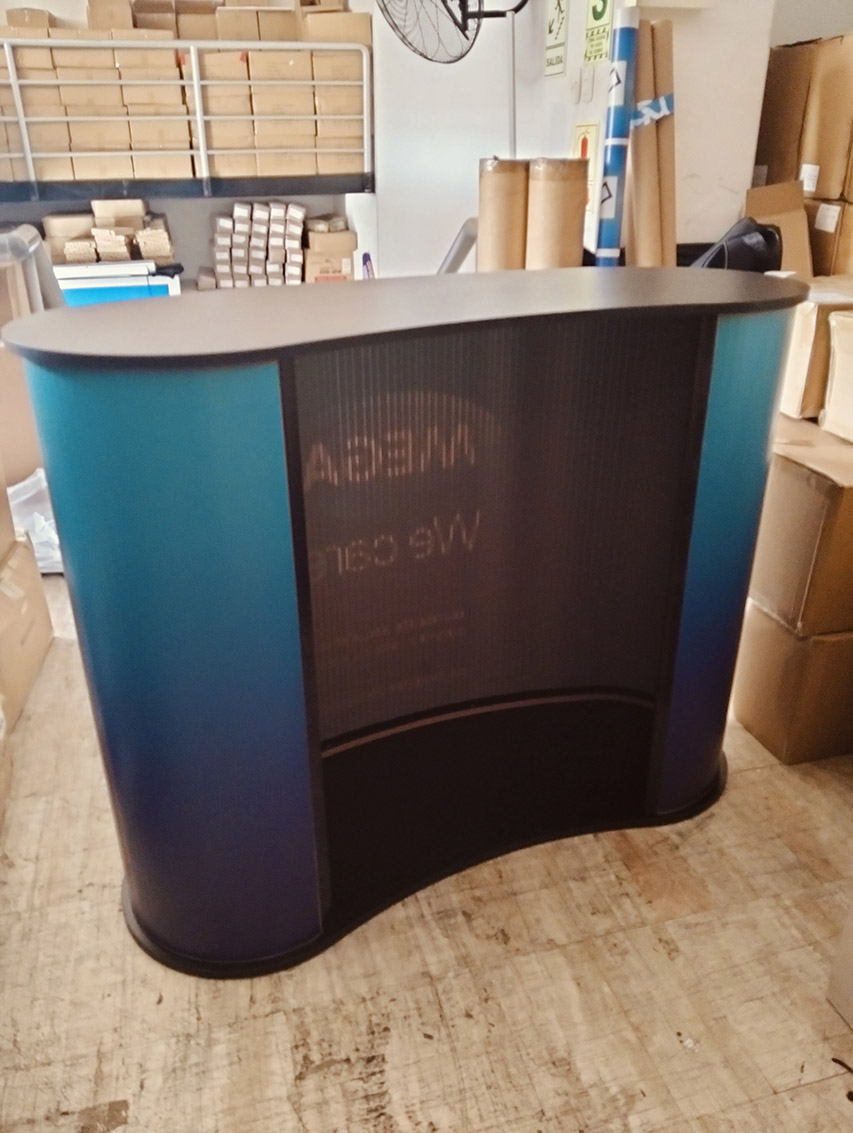 Es un Mostrardor Counter Curvo. Ideal para atención al cliene e punto de venta. Es desarmable con su publicidad en vinil adhesivo en un material corrugado. Su mesa y base en material MDF color negro acabado mate. Tiene su medida frontal de 1.35x90cm
